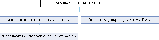 Inheritance diagram for formatter< T, Char, Enable >: